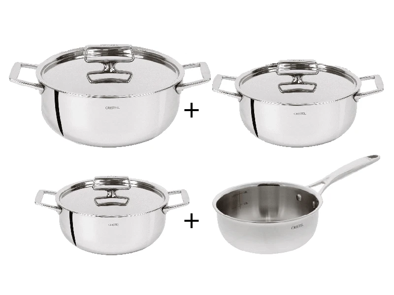 Het Franse topmerk Cristel ontwikkelde de lijn Castel’Pro voor gebruik in de professionele keuken zowel als thuis. Deze pannen zijn opgebouwd uit vijf verschillende lagen. Aan de buitenzijde zit een laag 18/0 edelstaal, gevolgd door een laag aluminium, een laag versterkt aluminium, een laag aluminium en aan de binnenzijde een laag 18/10 edelstaal. De pan heeft een dichtgelegde gietrand, waardoor de pan vaatwasmachinebestendig is. De gegoten roestvrijstalen grepen en stelen zitten met roestvrijstalen nagels aan de pan vast en geleiden weinig warmte. Door het gebruik van 18/0 staal zijn Castel’Pro pannen zowel geschikt voor alle warmtebronnen en om in de oven te gebruiken.