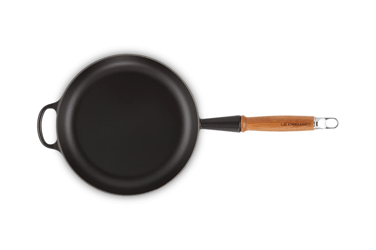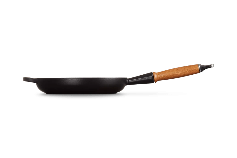 Het geëmailleerd gietijzer van de Le Creuset koekenpan weerstaat hoge temperaturen. Hierdoor is de pan zeer geschikt voor het bakken vlees en aardappels.