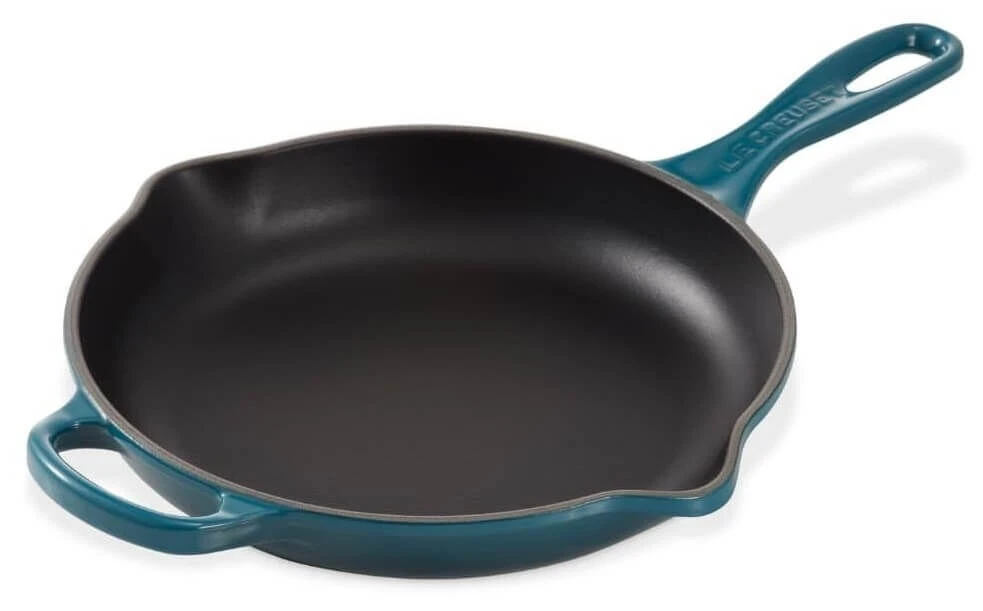 De skillet van Le Creuset is gemaakt van blauwgroen geëmailleerd gietijzer. De pan heeft een diameter van 26 cm en heeft hoge wanden, waardoor de pan als sauteuse tegebruiken is. Gebruik de skillet voor het bakken van vlees of eieren en het bereiden van gegratineerde gerechten. Door de tegengreep is de pan gemakkelijk te tillen.
