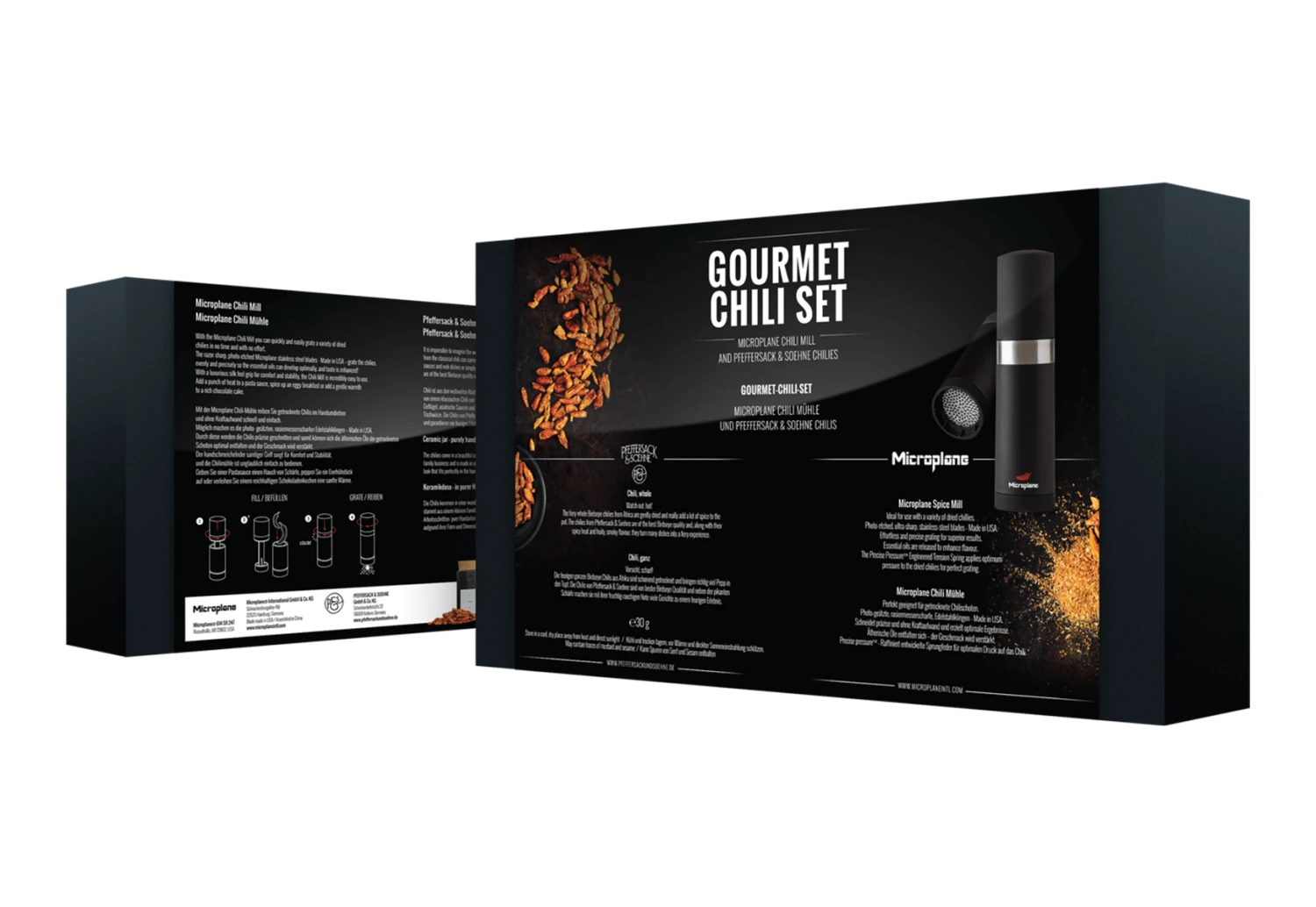 De Microplane chilimolen is gemaakt van zwart kunststof en heeft een rasp van roestvrij staal. De rasp heeft een fijn profiel voor het raspen van harde specerijen als kaneel en nootmuskaat. Door de het bovenste deel in het het onderste te draaien wordt de muskaatnoot langs de rasp gehaald. Eventuele voorraad kan worden opgeborgen in het bovenste deel van de rasp. De cadeauset wordt geleverd met de peper.