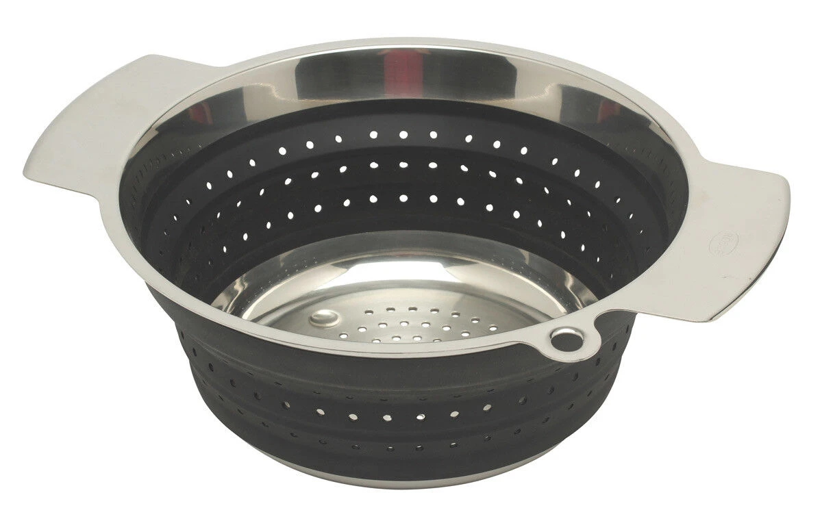 Het vergiet van Rösle heeft een inhoud van 3,4 liter en een diameter van 24 cm. Het vergiet is van roestvrij staal en heeft een zwarte siliconen wand, waardoor deze opgevouwen met een dikte van 4 cm is op te bergen. Gebruik het vergiet voor het afgieten van groenten en pasta’s.